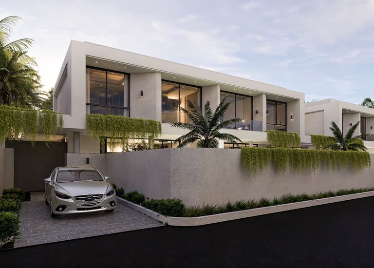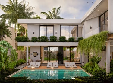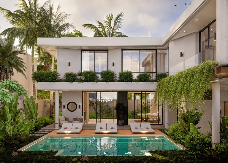 Modern Mediterranean villa with Balinese flair, lush greenery, and a private pool for the ultimate serene escape.